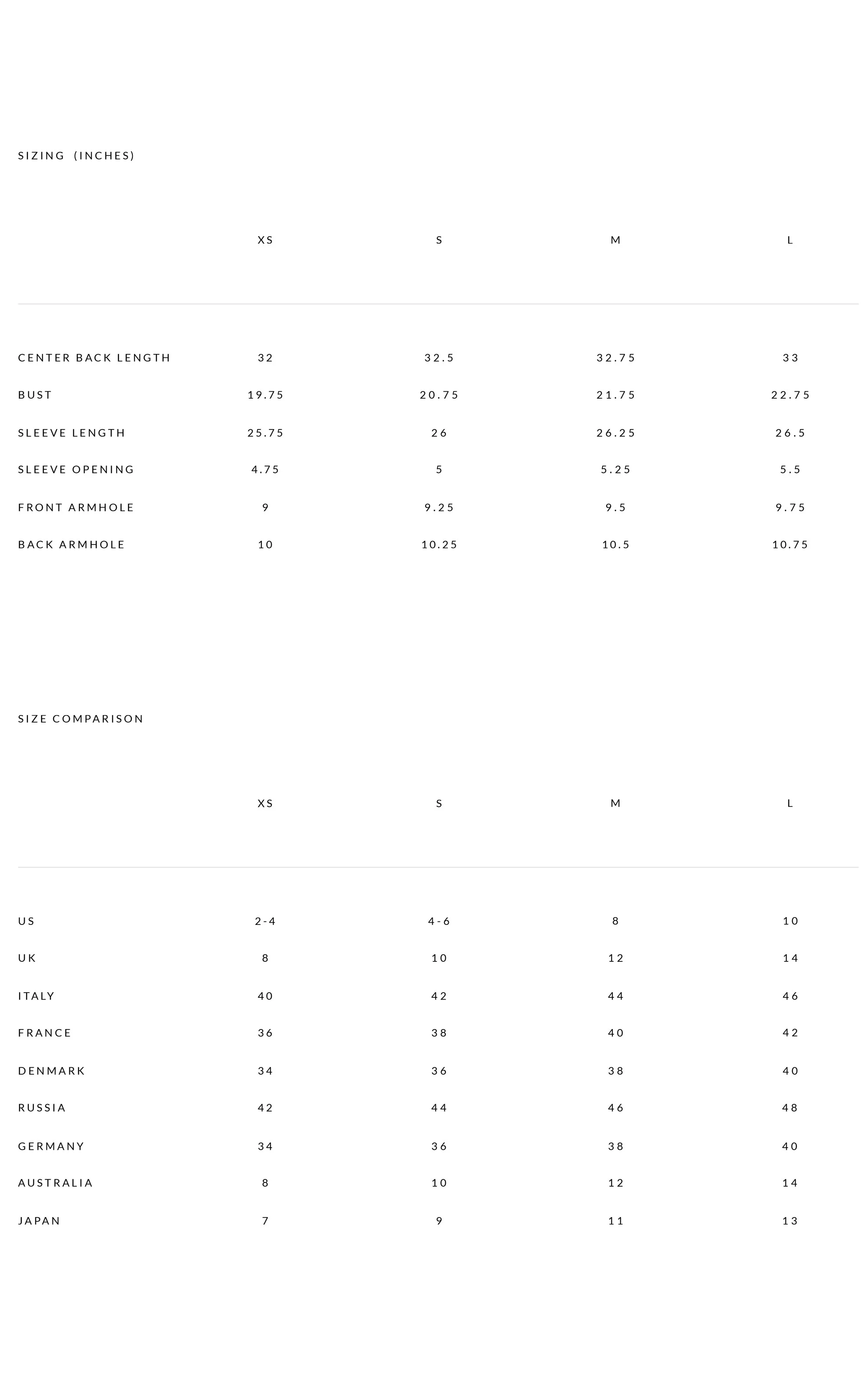 For garment measurements, please see our